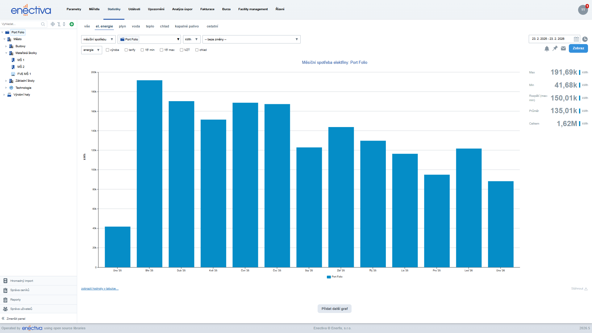 Po přihlášení do aplikace Enectiva se standardně otevře záložka Statistiky. Pokud má uživatel vytvořený dashboard s grafy, zobrazí se místo této záložky dashboard.
