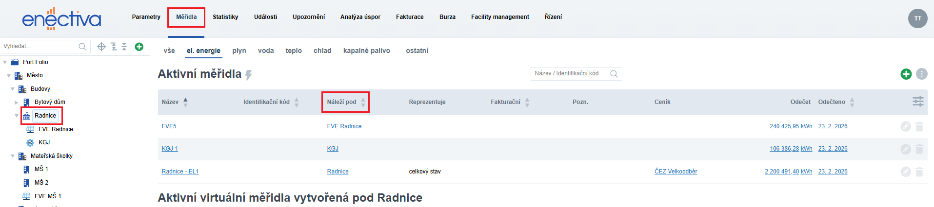 Po výběru objektu v levém panelu se aktualizuje obsah hlavní části obrazovky. Zobrazená data odpovídají výběru a všem podřízeným objektům. Například po otevření záložky Měřidla se zobrazí všechna měřidla vybraného objektu a všech jeho podřízených objektů.