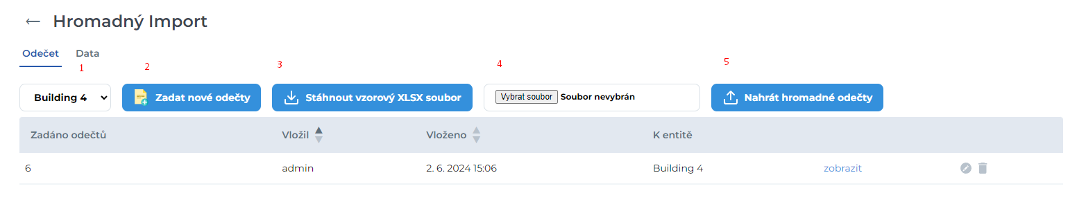Hromadné odečty se používají k zadávání odečtů pro více měřidel najednou. Naleznete je pod strukturou budov nalevo. Úvodní stránka vypadá takto.