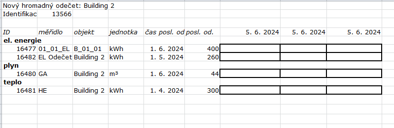 Hromadné odečty se zadávají do tmavých ohraničených buněk vpravo. Buňky jsou automaticky přednastaveny na 3 dny. V případě potřeby můžete datum změnit ručně, ale zachovejte stejný formát. Pokud v souboru nevidíte žádná měřidla, znamená to, že pro daný objekt nejsou žádná měřidla nastavena (nájemce, budova, komplex). Lze je nastavit v sekci Měřidla