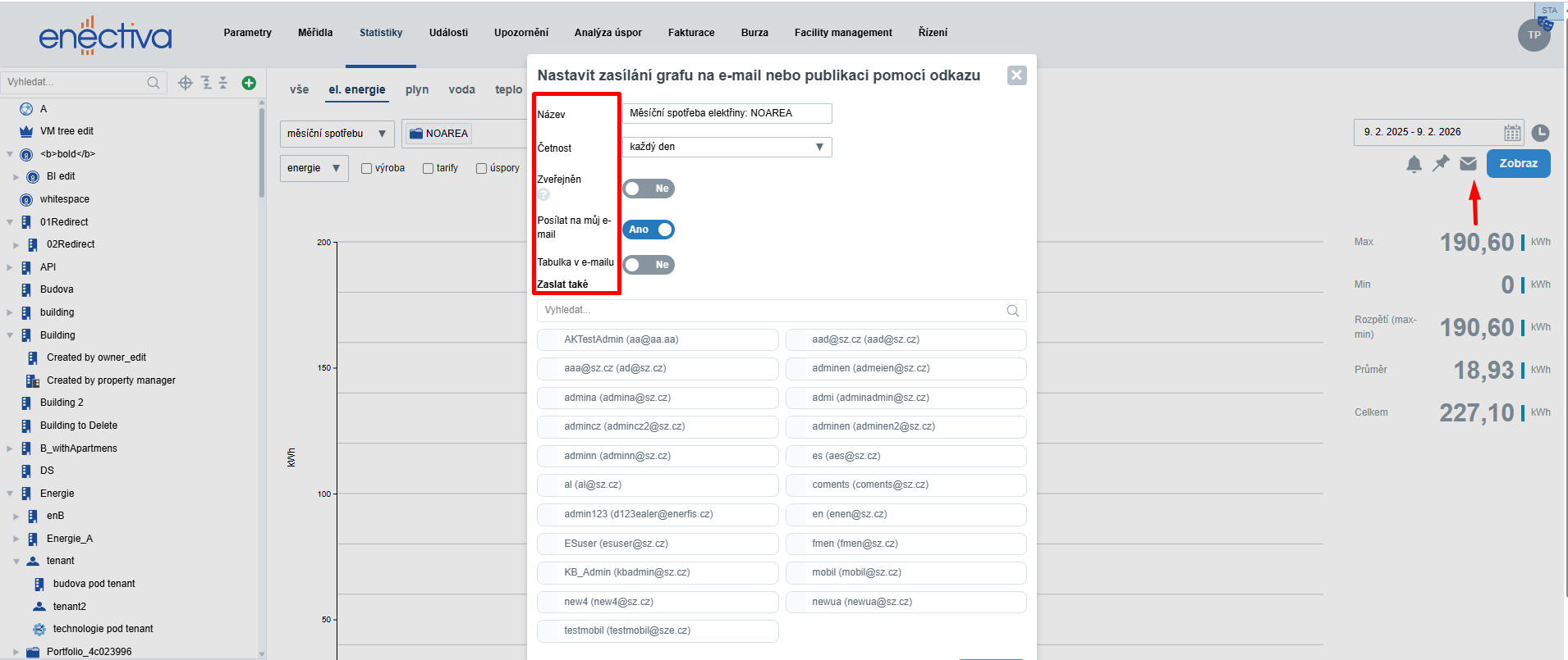 Enectiva umožňuje automaticky zasílat grafy e-mailem. Vybraný graf lze také zveřejnit pomocí odkazu – ten lze sdílet i s osobami bez přístupu do aplikace.