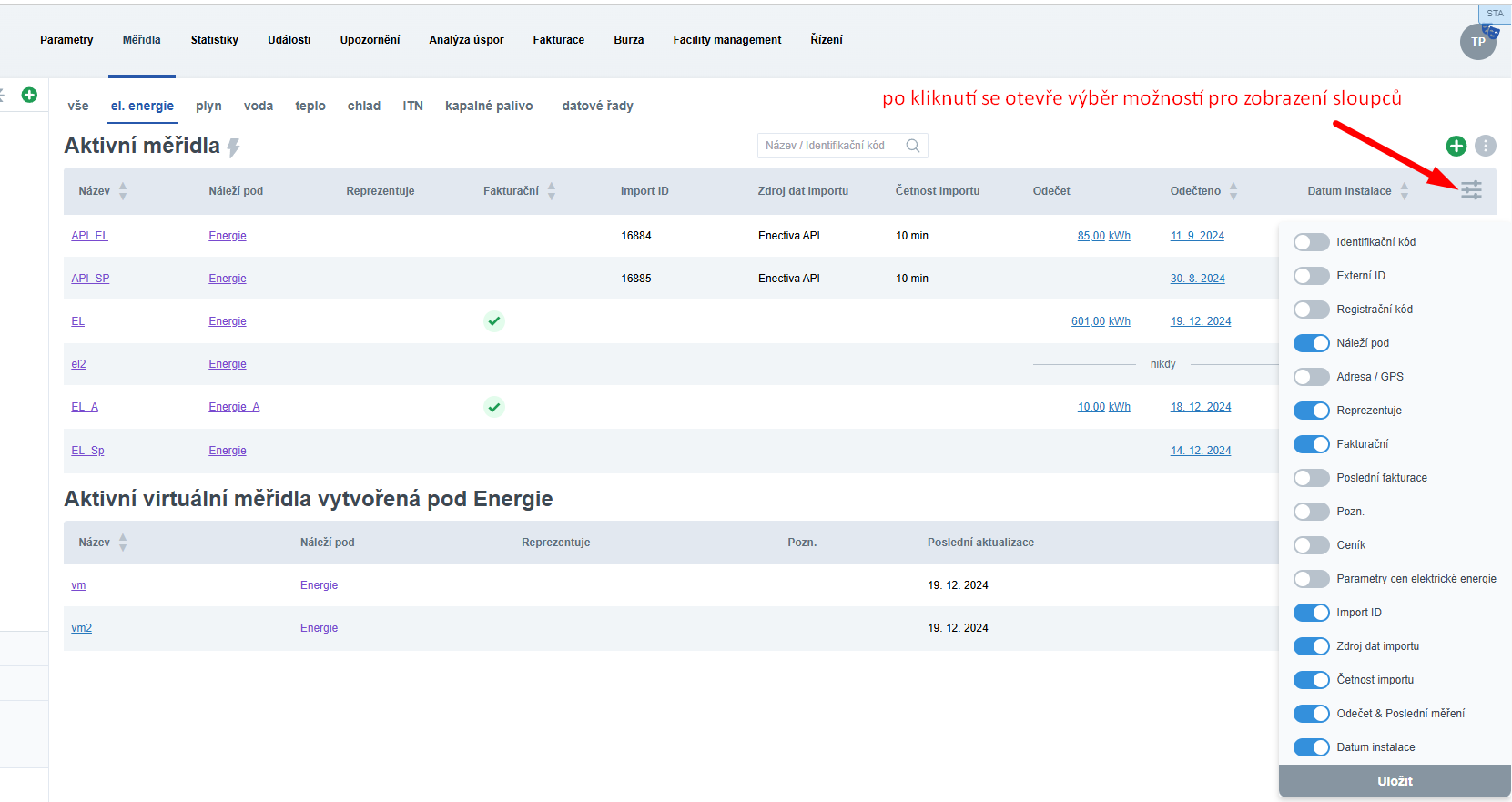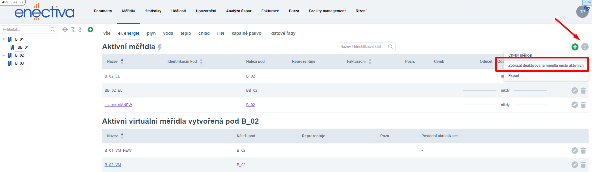 V přehledu měřidel se standardně zobrazují pouze aktivní měřidla. Uživatel má možnost pomocí rozbalovací nabídky v