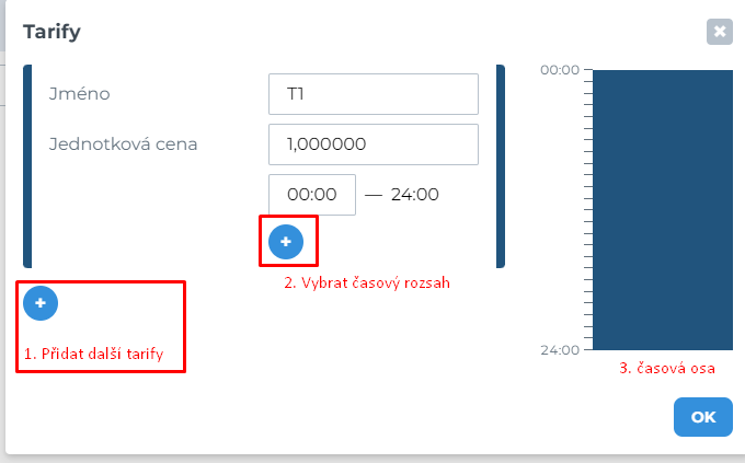 1. přidat další tarify - můžete nastavit nový název tarifu a jednotkovou cenu.