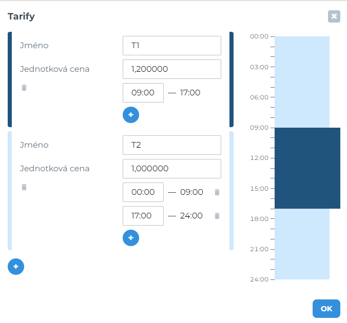 Vytvoření nových tarifů a nastavení aktivních hodin bude odráženo na časové ose na pravé straně. Konkrétní nastavení by mohlo vypadat podobně: