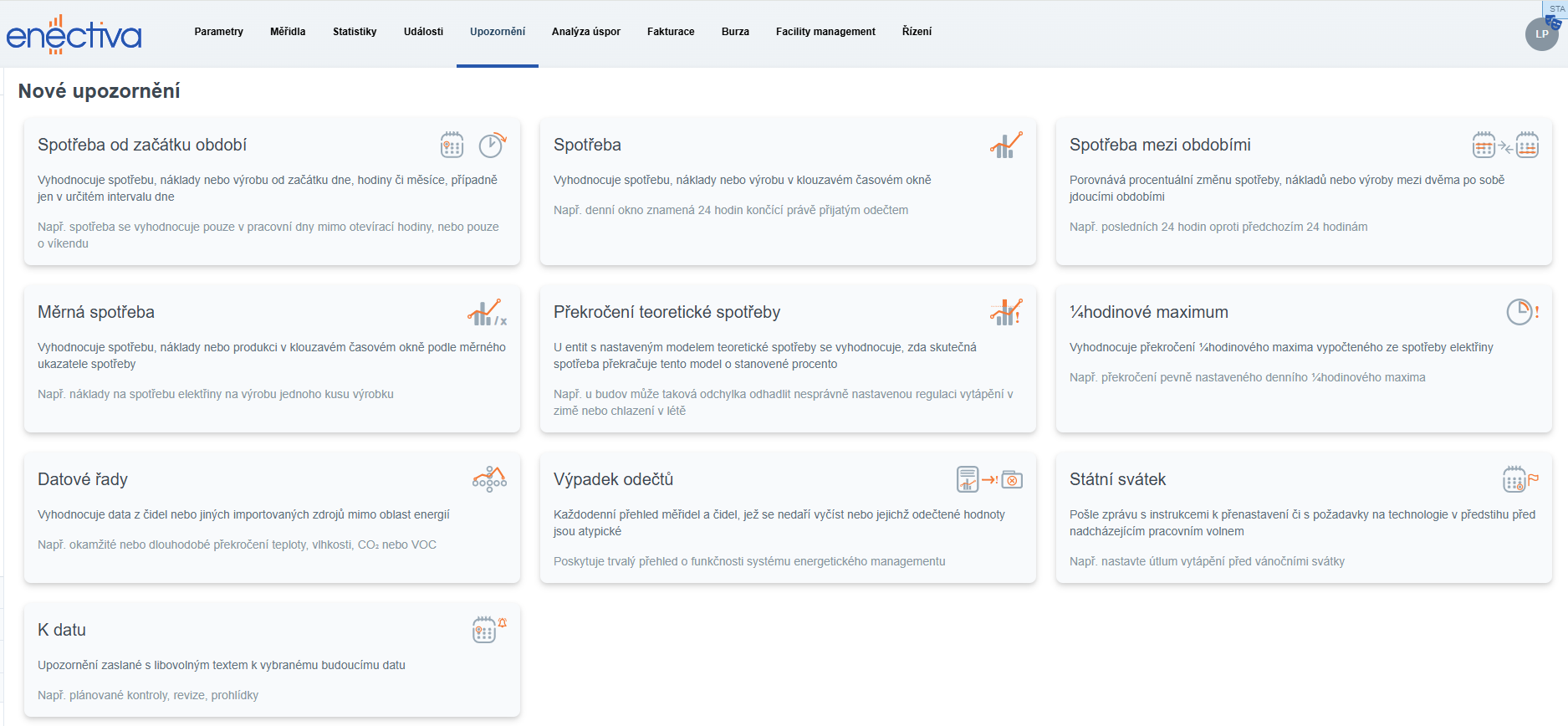 Aktuální seznam dostupných typů upozornění včetně jejich popisu je zobrazen při vytváření nového upozornění.