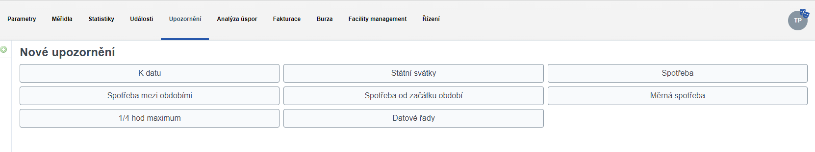 V této části má uživatel možnost nastavit upozornění, když dojde k určitým událostem. Upozornění mohou zahrnovat, ale nejsou omezena na, změny cen energie (když ceny klesají nebo stoupají pod / nad určitou úroveň), upozornění k určitému datu (vypršení čehokoliv), změny v spojitých datových řadách, změny spotřeby, náklady na importované hodnoty.