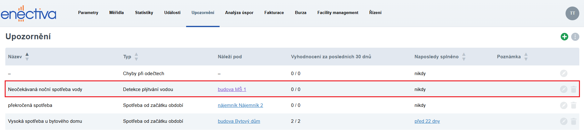 Další funkcí aplikace Enectiva je upozornění na neočekávanou noční spotřebu vody. Tato funkce je určena zejména pro provozy, které nejsou po určitou část dne v chodu - například kanceláře, kde se v nočních hodinách nenachází žádný pracovník a neměla by zde vznikat spotřeba vody.