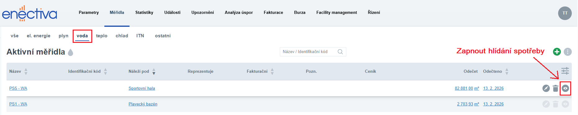 U měřidel vody se v seznamu automaticky zobrazuje šedá ikona oka.