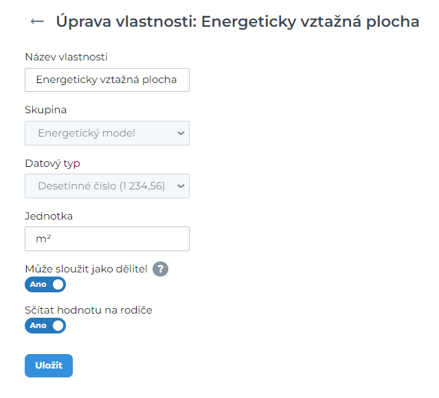 U “Energeticky vztažná plocha" jako u všech vlastnostech musí být vybrán ze seznamu datový typ a napsaná jednotka. Následně provedené změny uložit.