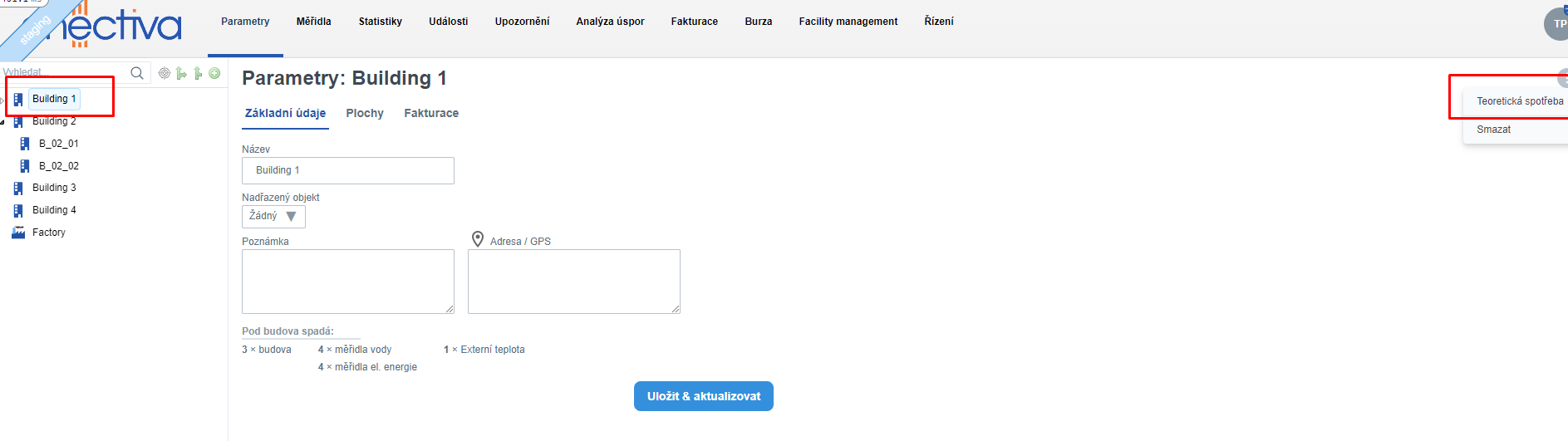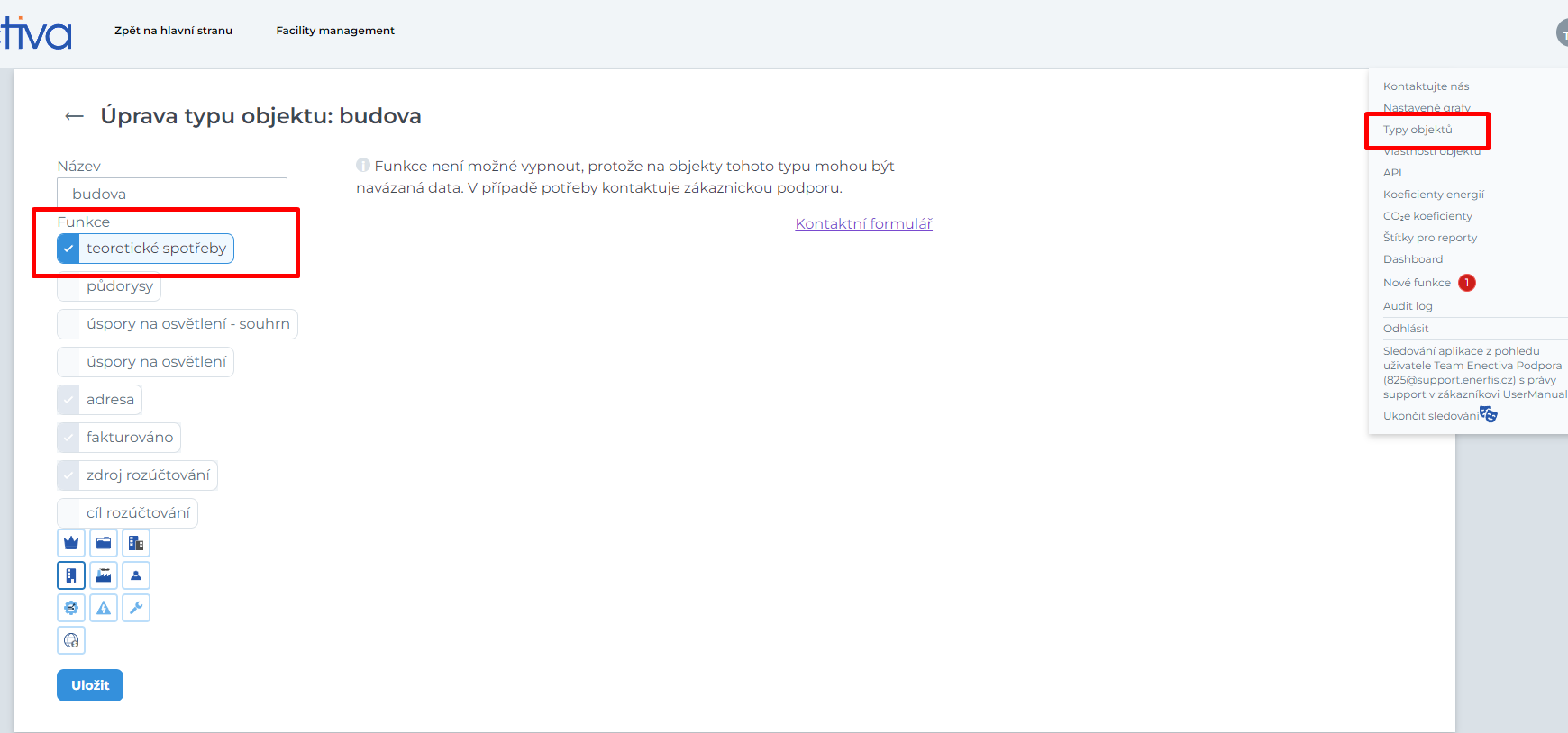 Pro možnosti teoretické spotřeby musí mít daný objekt tuto funkci Teoretická spotřeba nastavenou. V pravém horním rohu vybrat Typy objektů, zvolit požadovaný objekt např. Budova a editovat - vybrat funkci Teoretická spotřeba a uložit