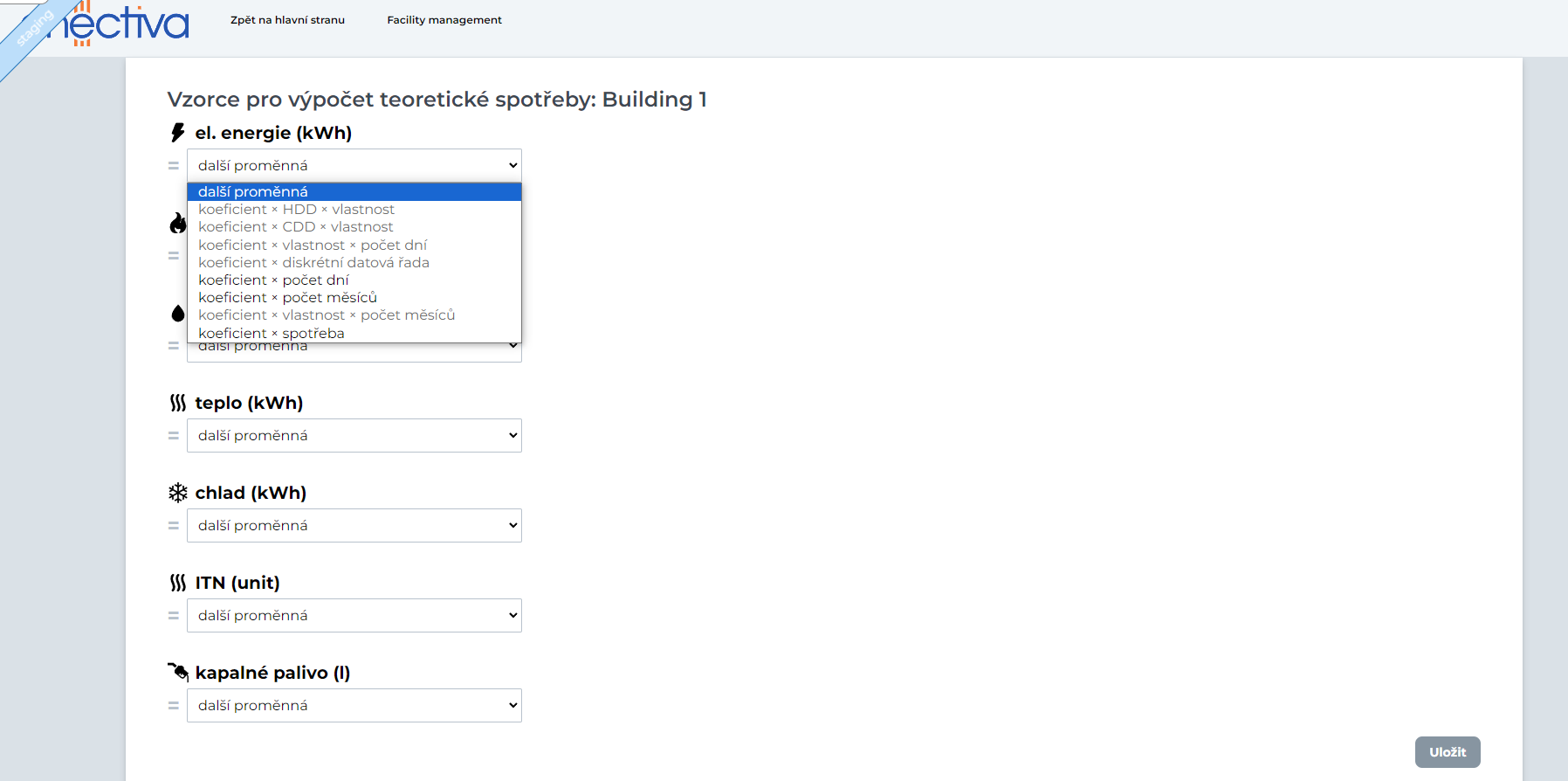 - Každý řádek reprezentuje jeden druh energie - po kliknutí na další proměnná je možné vybrat požadovanou formuli pro výpočet teoretické spotřeby.