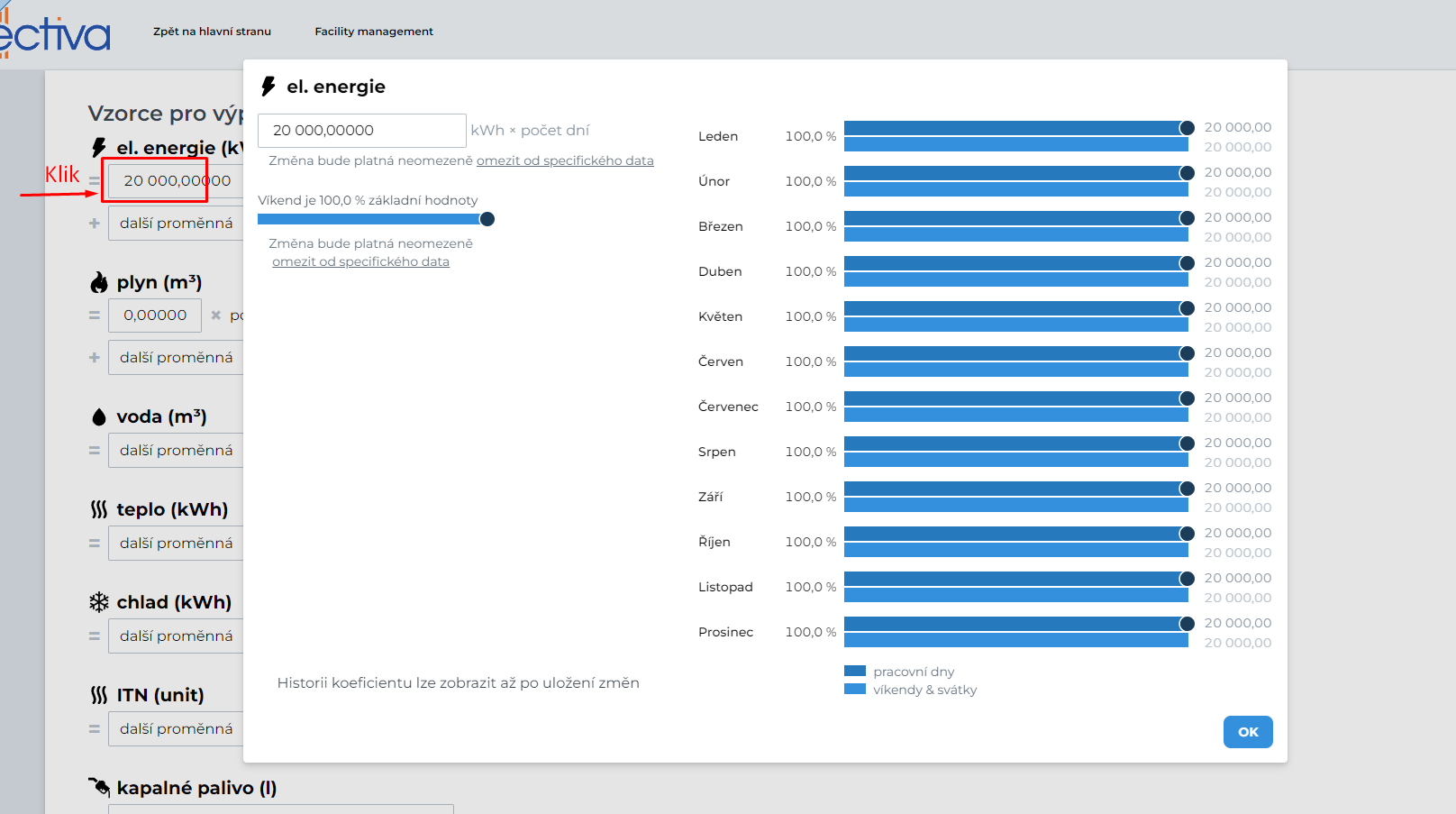 Pomocí posuvných os na pravé straně můžete nastavit jak se měsíční spotřeba mění napříč celým rokem. Fungují na stejném principu jako osa pro víkend.
