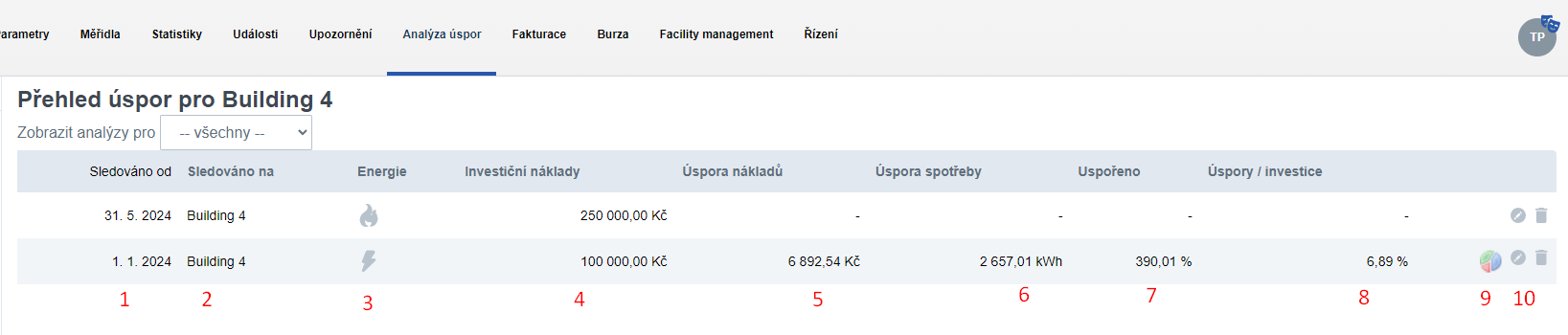 V této části můžete sledovat úspory energie po určitou dobu. Každá analýza úspor musí být zahájena událostí. Pod záložkou Analýza úspor vidíte seznam událostí, které by měly mít dopad na úspory energie.