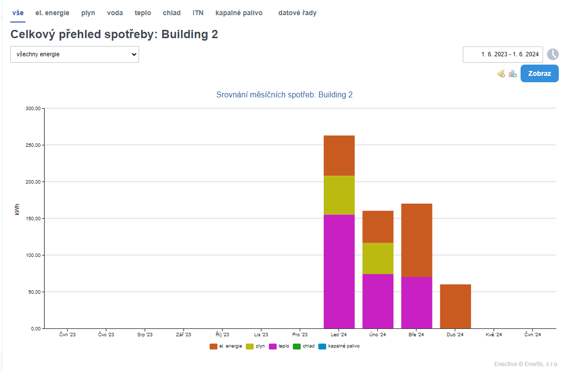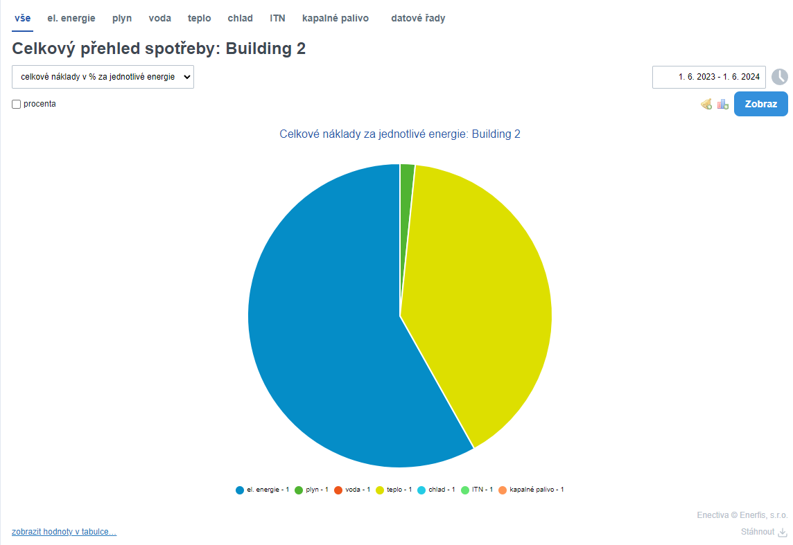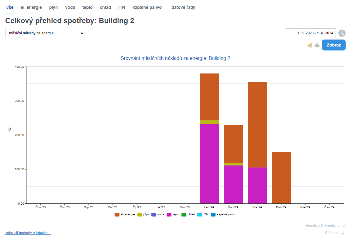 V kolonce Vše naleznete různé grafy pro zobrazení celkových spotřeb energií nebo nákladů, konkrétně: