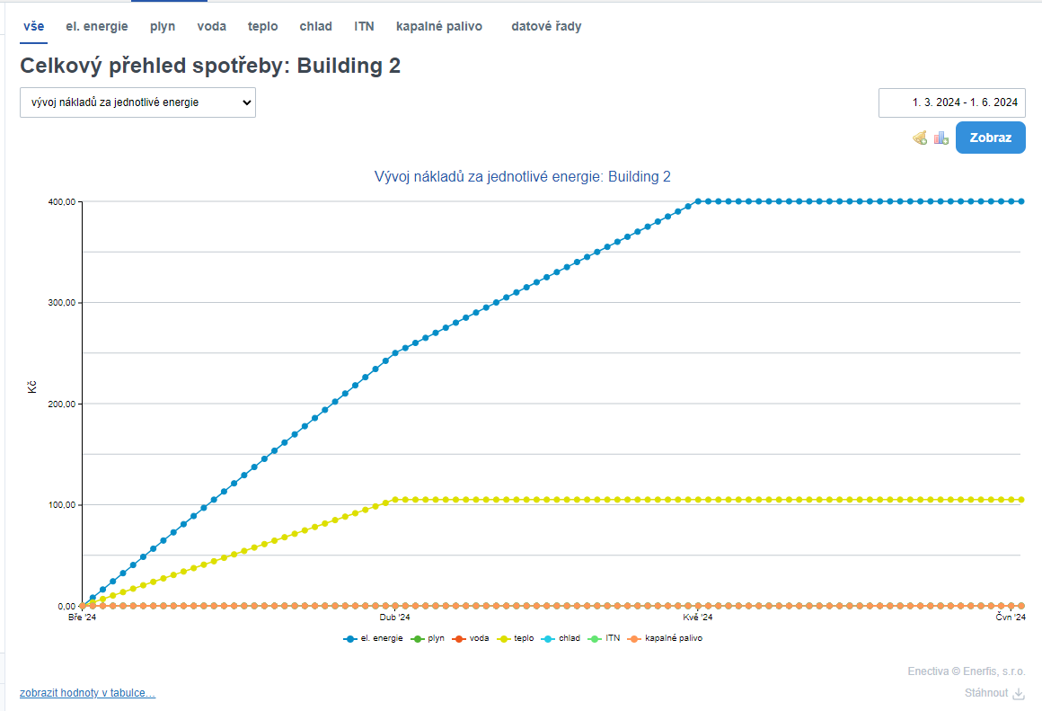 Zde můžete vidět, jak se celkové náklady na jednotlivé energie zvyšují během vybraného období. Největší výhodou tohoto typu grafu je, že snadno zjistíte rostoucí náklady a okamžitě analyzujete výkyvy v trendu spotřeby.