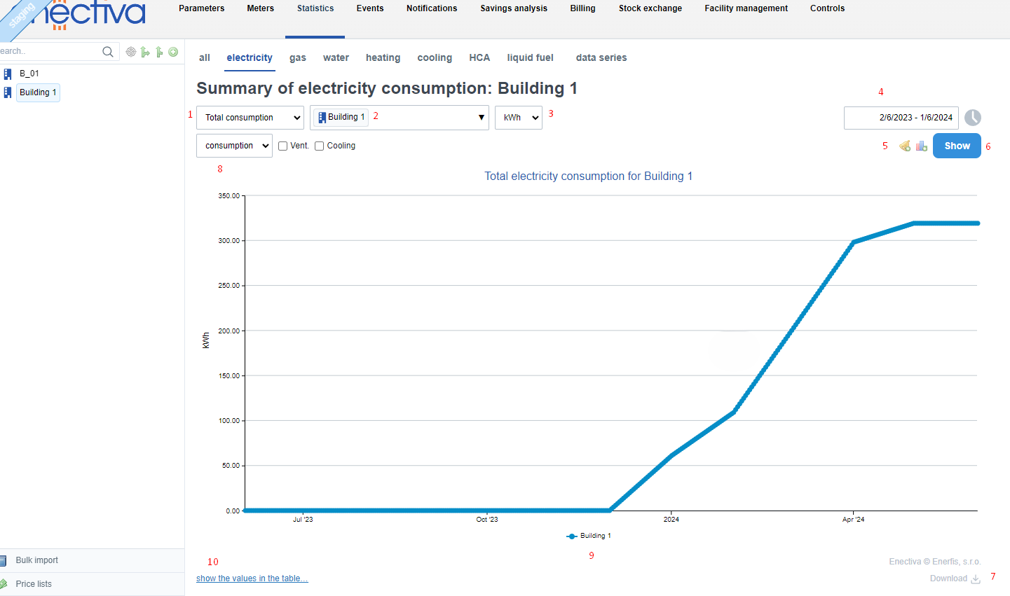 V následujícím příkladu zobrazujeme celkovou spotřebu budovy “BUILDING 1”, kde si popíšeme všechny prvky, které můžete