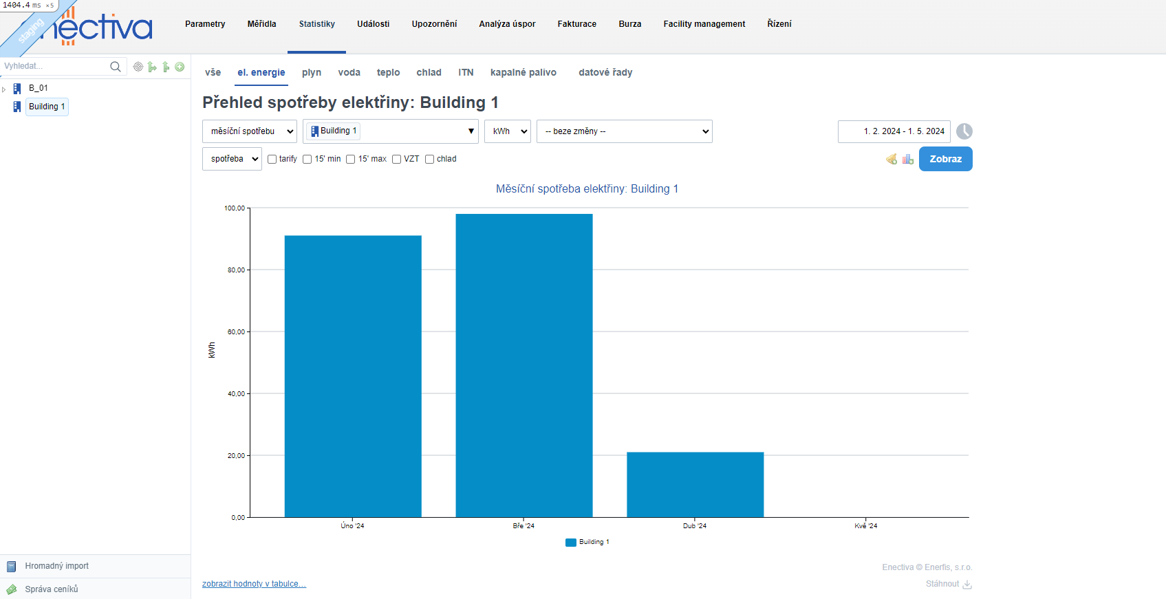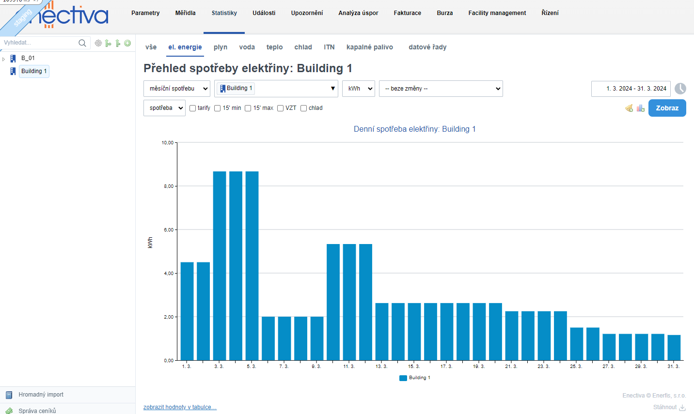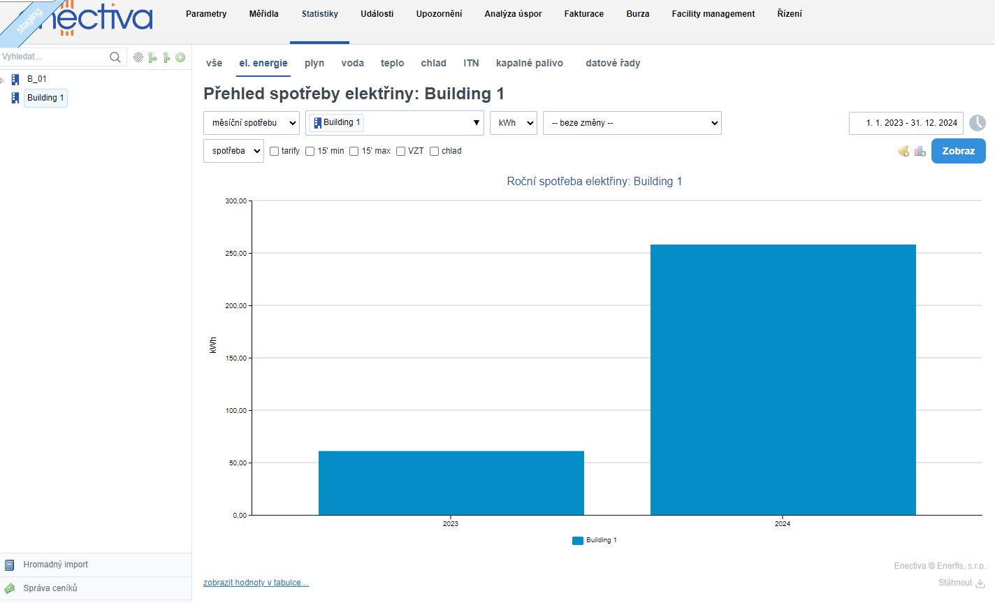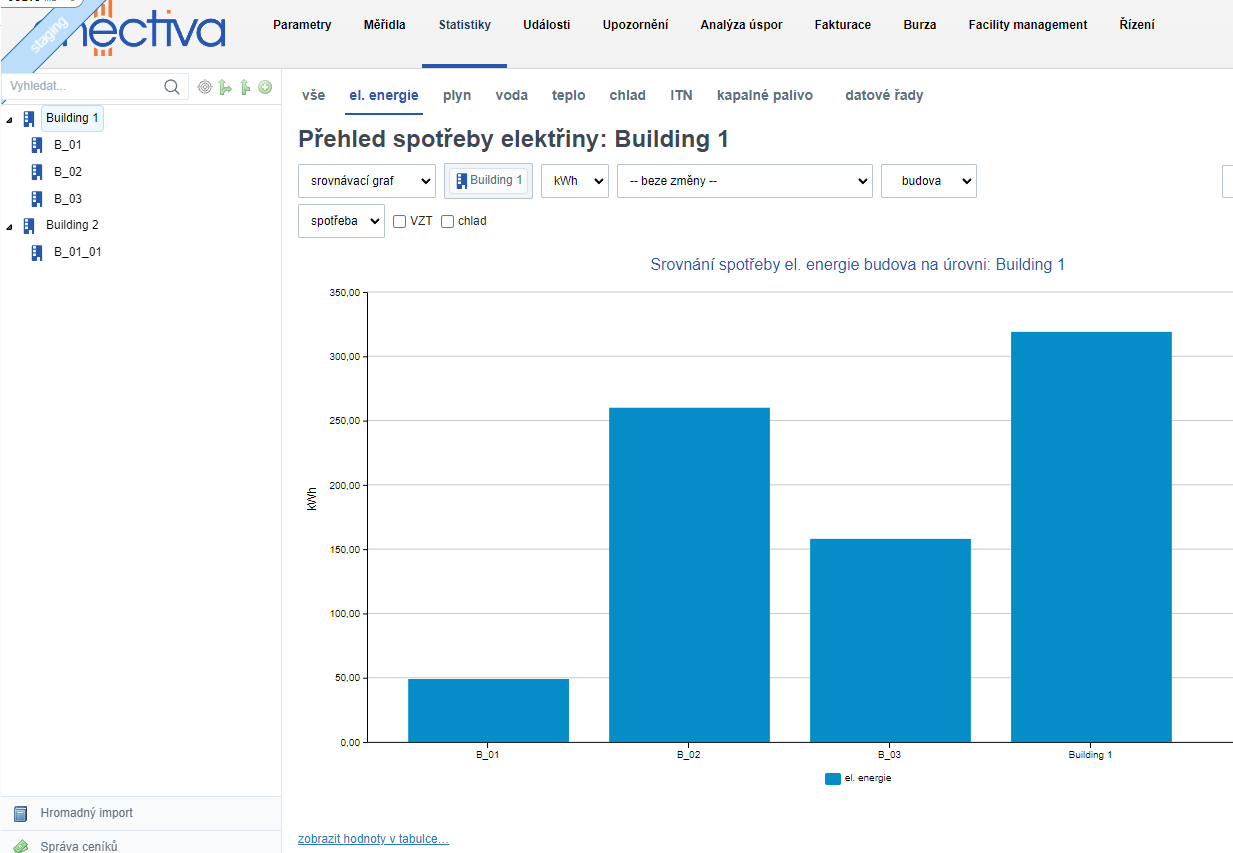 Na úrovni budovy nebo komplexu si můžete vybrat, zda chcete zobrazit podružná měřidla patřící hierarchicky k budově nebo komplexu. V našem příkladu si můžete na úrovni budovy “BUILDING 1” zvolit zobrazení statistik nejen za budovu jako celek, ale také za jednotlivé nájemce, či měřidla. Můžete také zobrazit spotřebu dohromady s datovými řady, například spotřebu v závislosti na venkovní teplotě nebo v závislosti na jeden vyrobený produkt (v případě továrny).