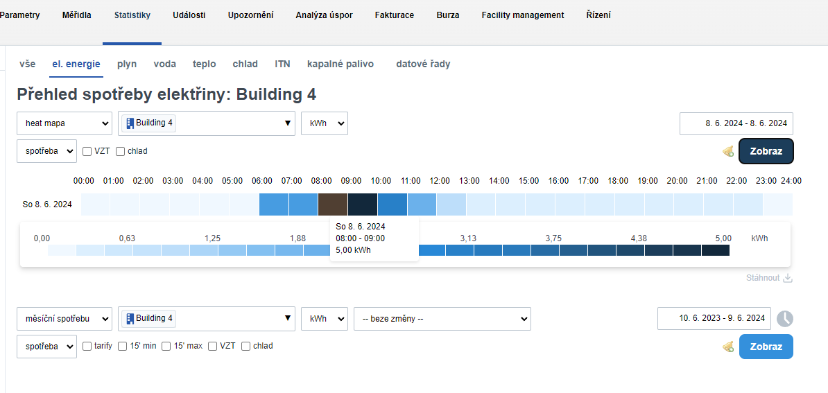 Jednotlivá měřidla a budovy si zobrazíte v kartě příslušné energie. Můžete si vybrat z několika typů grafů, podle toho, jaký se pro danou situaci hodí nejlépe. Na výběr je z těchto možností: