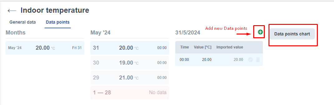 You can view data on the Data Points tab. You can display the data similarly to the Statistics using the Data Points Chart button. If you want to add a data value manually, click the Add New Data Point button, enter the value, and adjust the date and time. The difference between the value and the actual value is that the value equals the coefficient multiplied by the actual value.