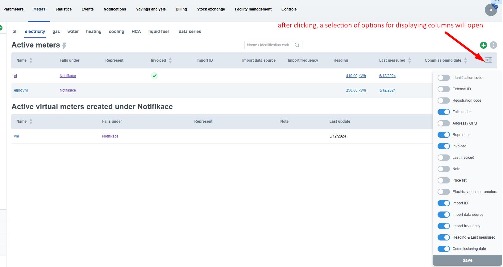 You can customize the display of columns in the meter table according to your needs using a button located in the
