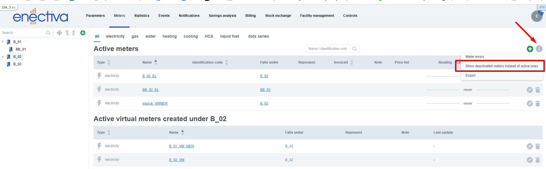 In the meter overview, only active meters are displayed by default. The user has the option to switch to displaying deactivated meters using a drop-down menu in the top-right corner. Similarly, the display of deactivated meters can be turned off again.