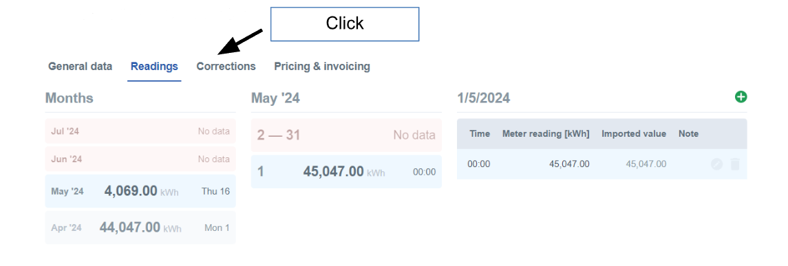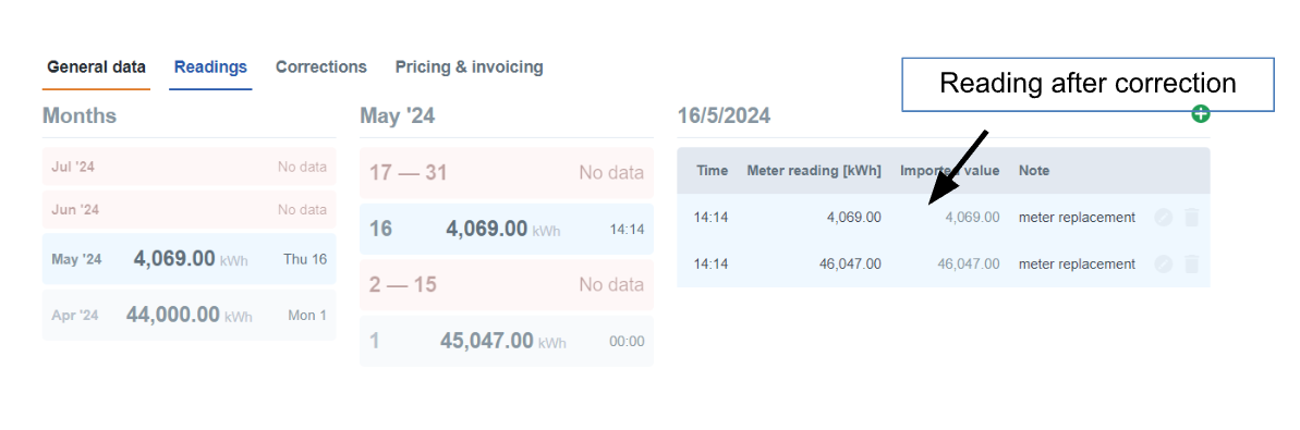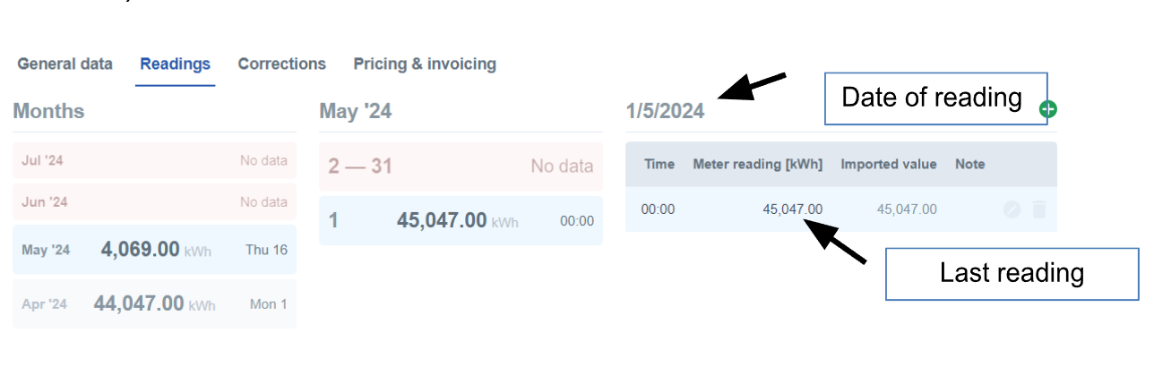 - In the "Readings" tab, we can see the last reading we have for this meter (45047 kWh as of 01.05.2024)