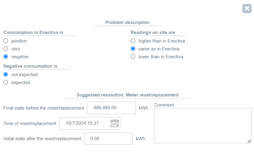 - In the "Problem Description" section, we do not make any changes; everything remains as is. We are interested in the information under "Suggested resolution: Meter reset/replacement" where we enter details from the meter replacement protocol: