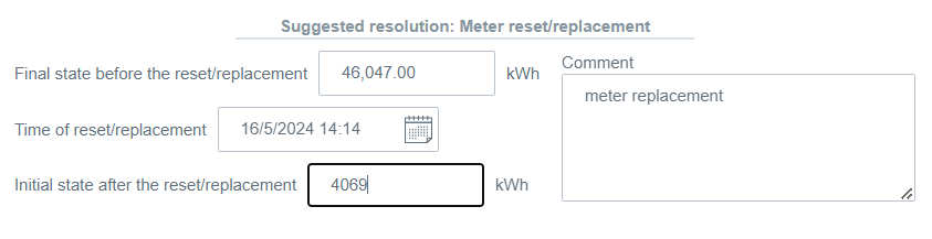 - According to the meter replacement protocol, we have information that the replacement took place on 05/16/2024 at 14:14:48. The last reading of the original meter was 45047 kWh and the reading of the new meter is 4069 kWh.