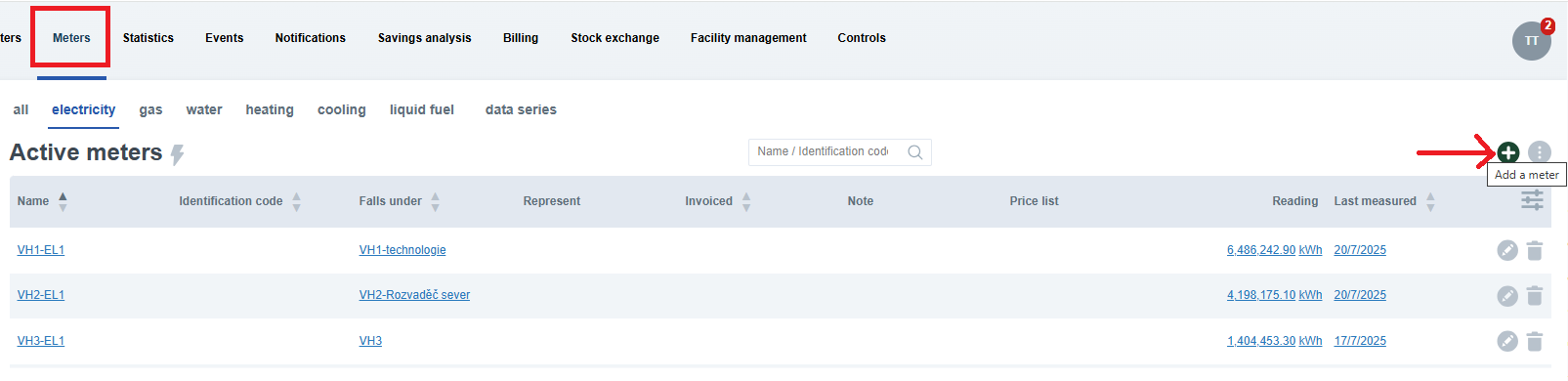 Additional options depend on the type of meter (electricity, water, heating, etc.) and whether it is