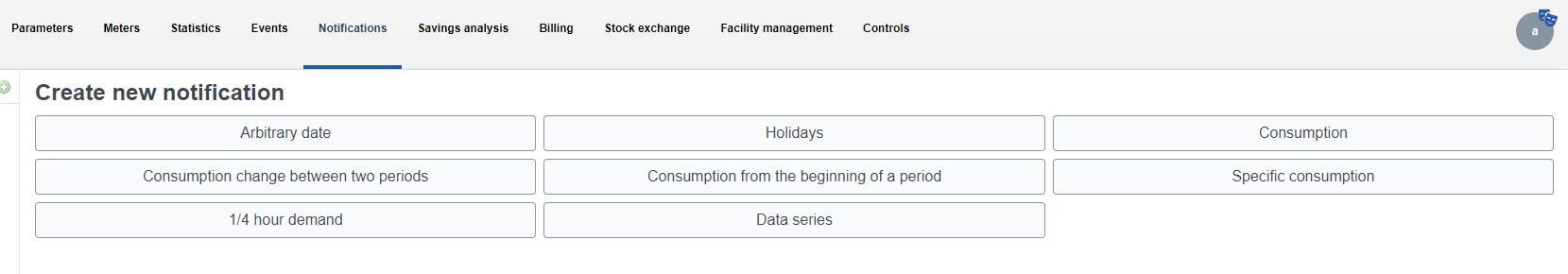 In this section, the user has the option to set alerts when certain events occur. Alerts can include, but are not limited to, energy price changes (when prices fall or rise below/above a certain level), alerts on a certain date ( expiration of anything), changes in continuous data series, changes in consumption, cost of imported values.