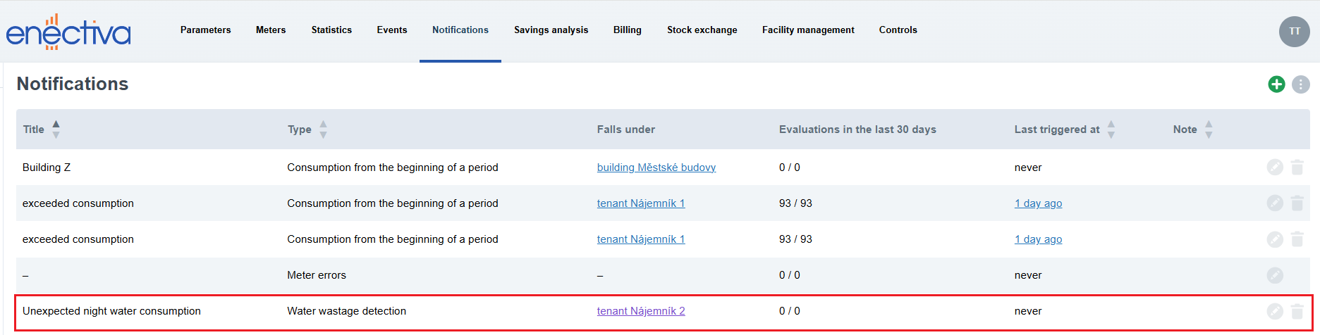 To turn on alerting for the Unexpected night water consumption notification, click the grey eye icon. The icon turns blue, the notification is activated, and it appears in the list of notifications.