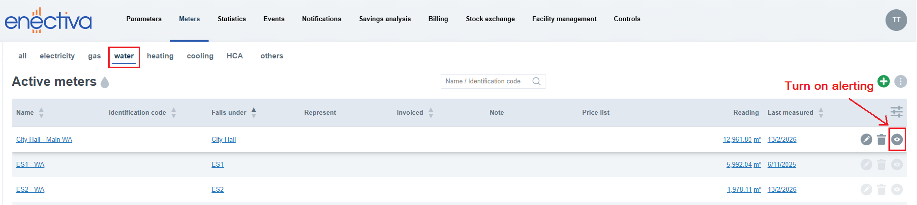 For water meters, a grey eye icon is automatically displayed in the meter list.