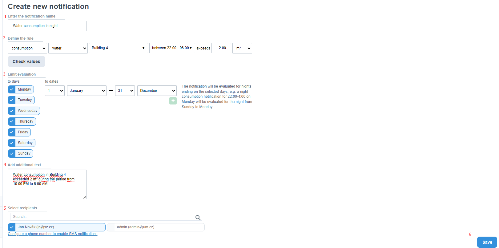 - Here you can enter the text that will be displayed in the sent e-mail with a warning - e.g. "Water consumption in the Building 4 building exceeded 2 m3 in the time period from 22:00 - 6:00. "