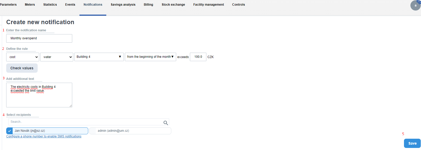 3. Send a message - here you can enter text that will be displayed in the sent email with an alert - e.g. "The electricity costs in Building 4 exceeded the limit value."