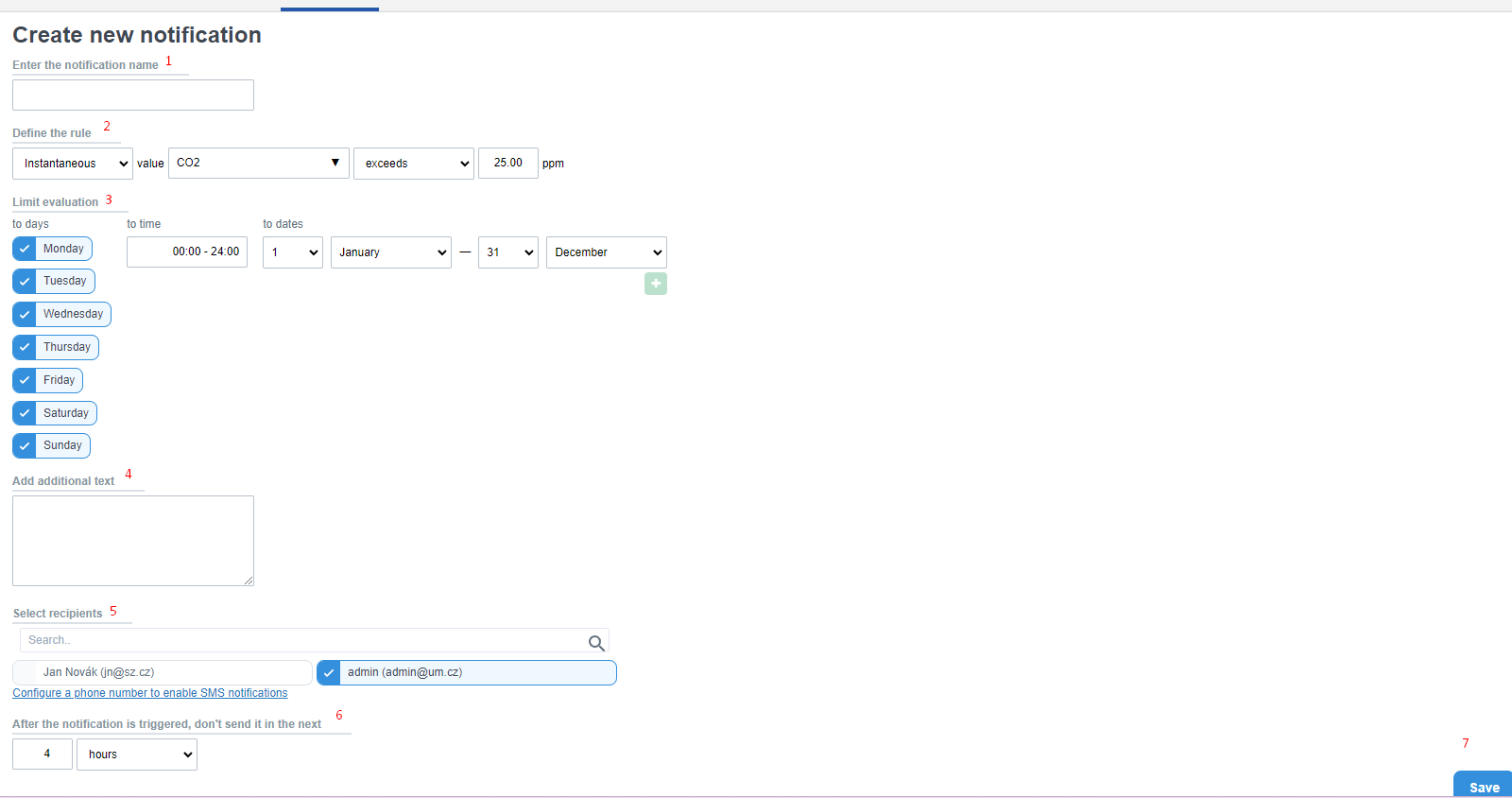 Example: this value is set to 4 hours. The CO2 concentration exceeded the set limit at 10:00. A notification was sent immediately. The situation is reassessed in 4 hours - at 14:00. If the concentration is still above the set limit, the notification will be sent again. If the concentration falls below the set limit, the notification will only be sent again if the concentration exceeds the set limit again in the future.