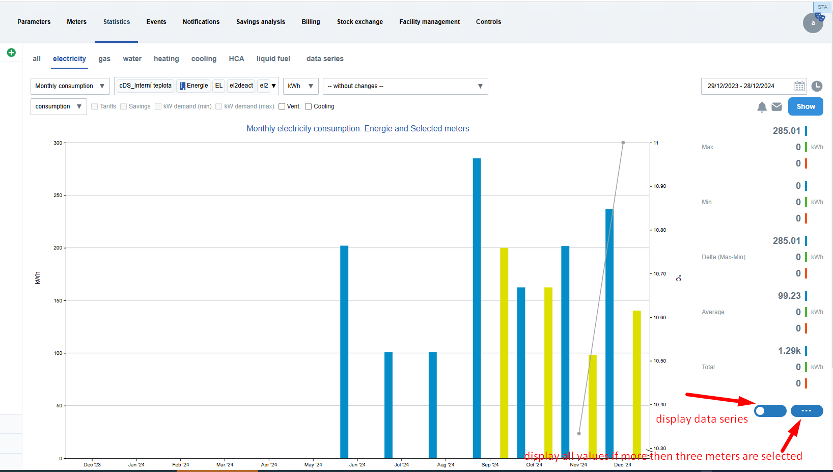 - Statistics are available only for periodic charts with a time axis (e.g., monthly or daily consumption).
